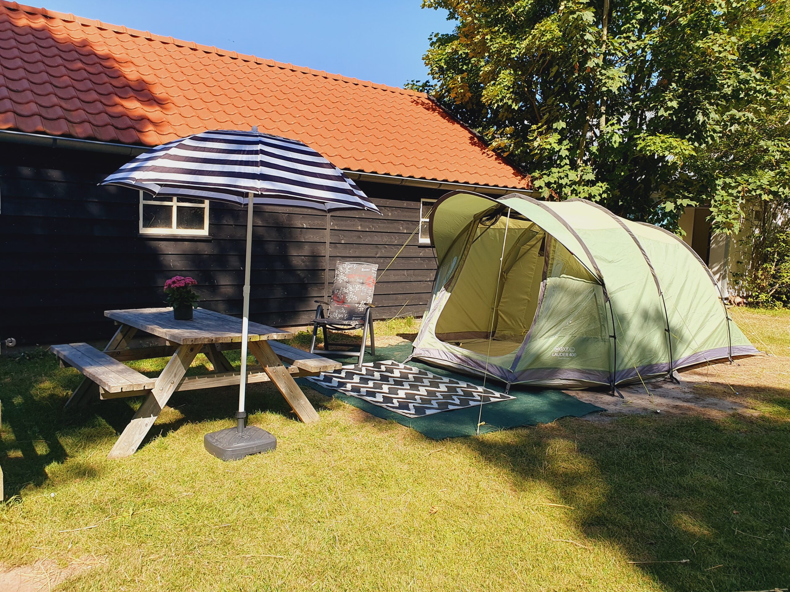 Onze 4 persoon huurtent staat in zijn eigen omheinde privé tuin met schuurtje waar u een BBQ en tuinset in vind waar u gebruik van kunt maken….. In de tent vindt u een 4 boxspring bedden van ieder 90 bij 2 meter . alle bedjes zijn opgemaakt! U vindt een heerlijke bank in de leefruimte, net als,waterkoker en Senseo koffie zetter. (koffie en thee suiker melk aanwezig) Onder de luifel staan het keukentje en de ijskast Huisdieren zijn toegestaan maar mogen nooit onbeheerd alleen in de tent verblijven!!!!